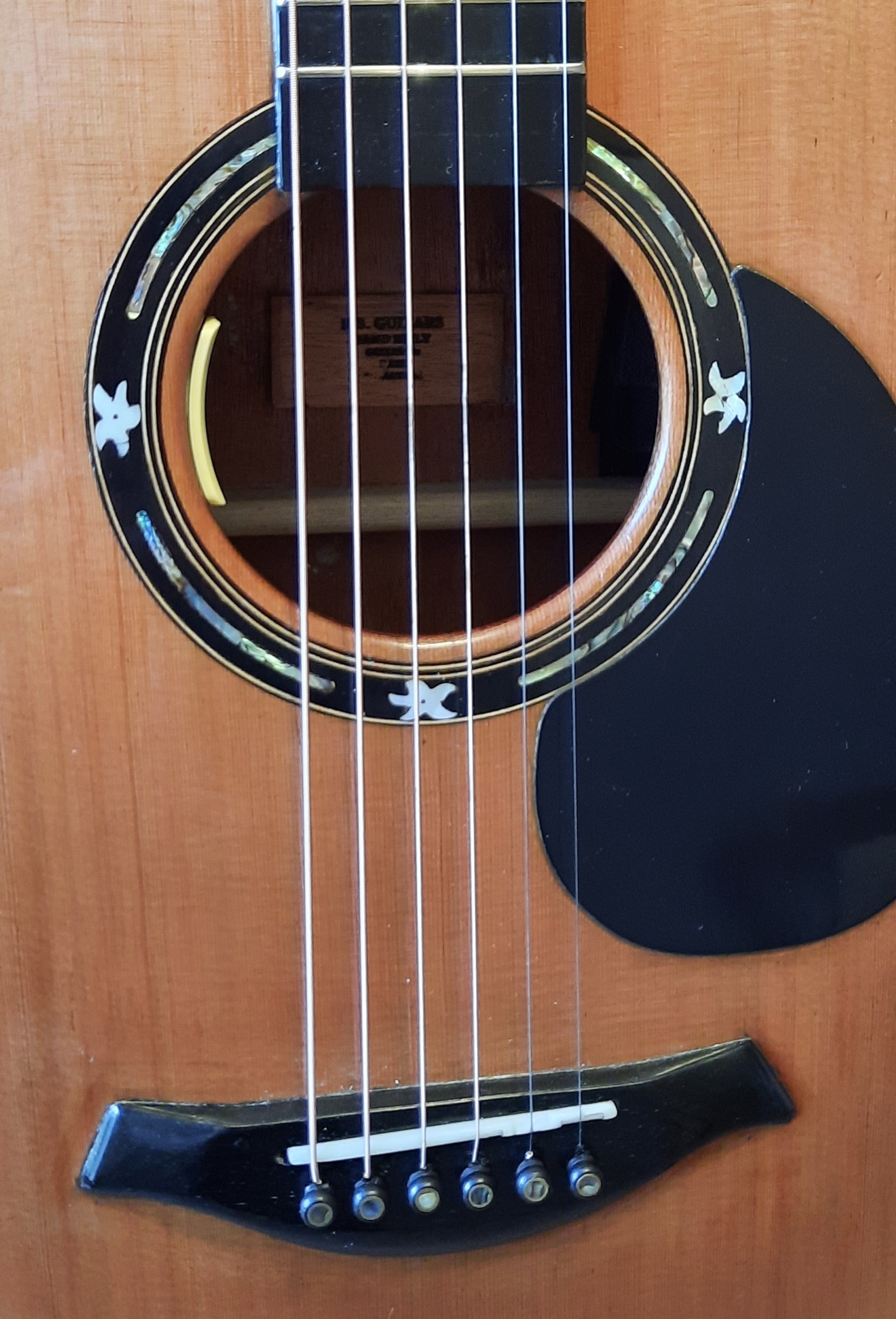 Solid Cider top – Solid Iroko back and sides – Mahogany neck – Black wooden binding – Black Ebony Headplate – Ebony fingerboard- Ebony bridge – Bone nut and saddle – Mother of Peral “Koi Fish” design on Headstock – Mother of Peral and Abalone inlay rosette – Abalone Top Purfling – Solid wooden scratch plate Dual truss rod – Silver Grovers – Fishman Active Under saddle Piezo pickup – French Polish finish – Cahaya Gig Bag or (added extra Hardcase)